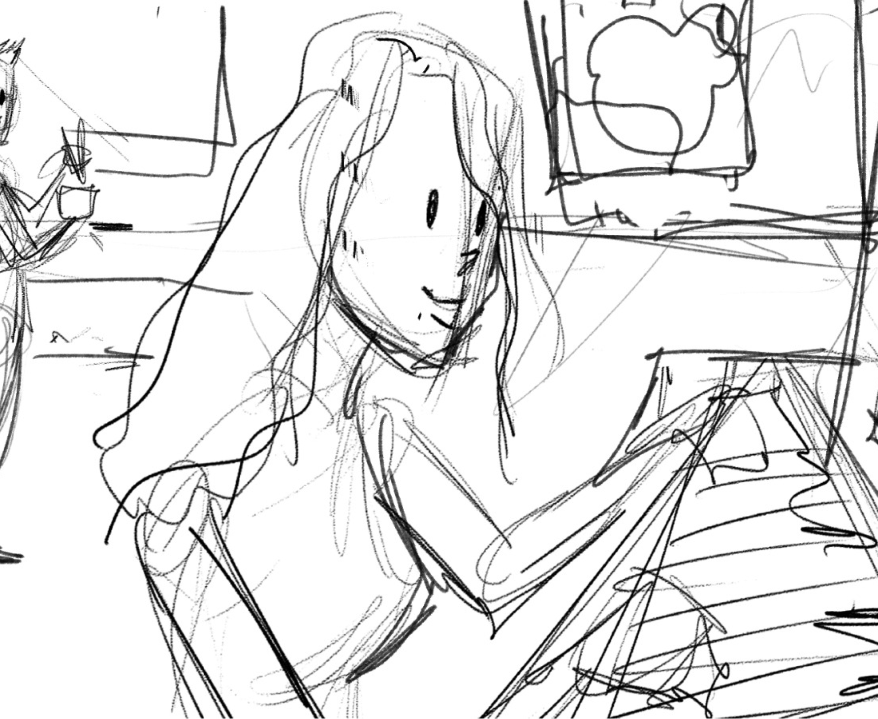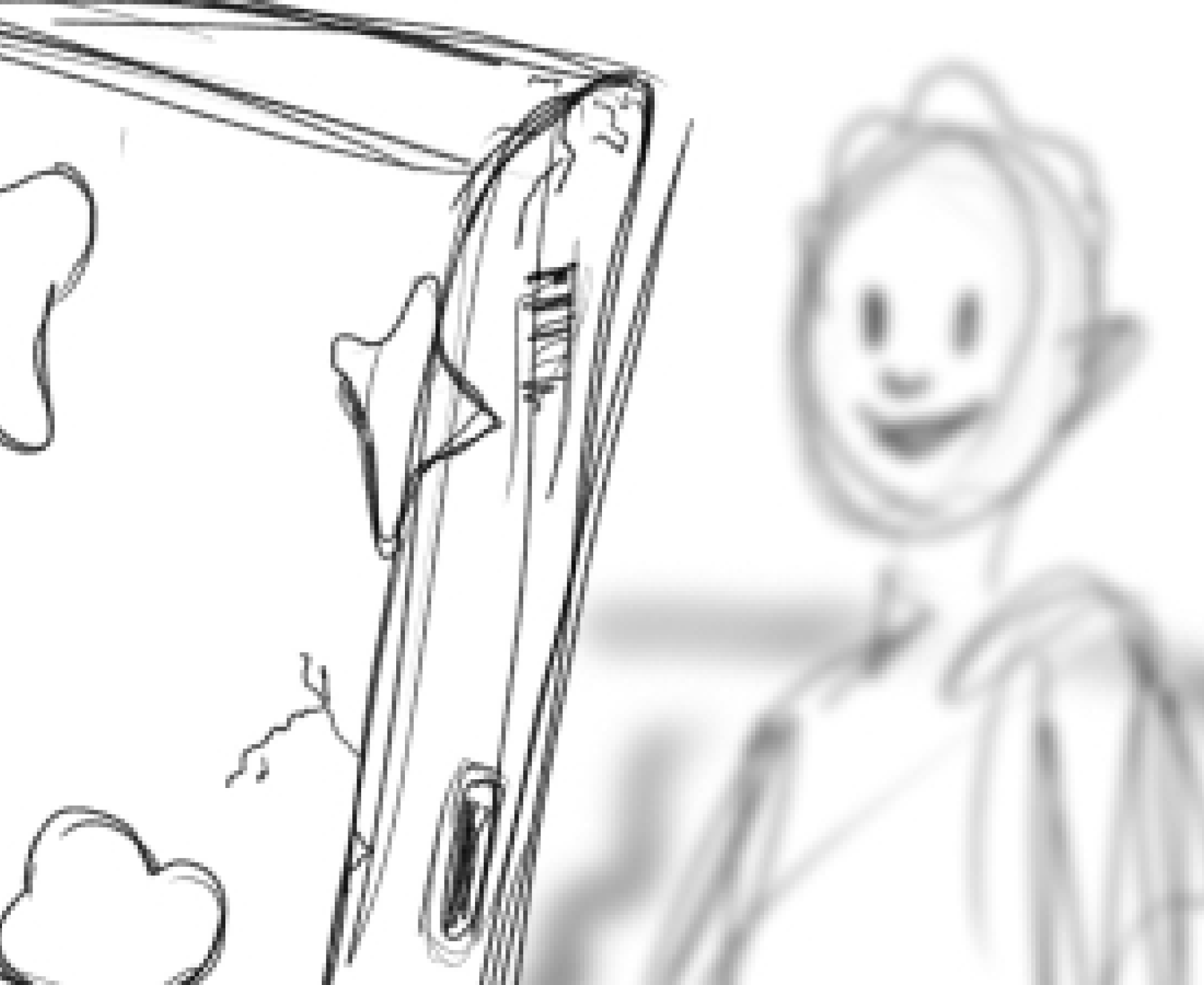 Sliding wide lens macro shot showing Bad Playing/Drawing/Cooking.