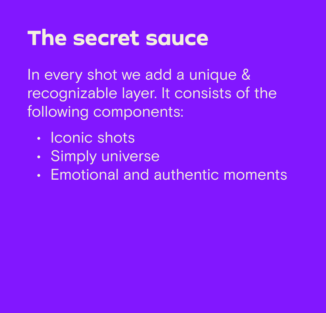 These are examples of our brand expression at its fullest potential and the minimal components that need to be present at any production to ensure we show the Simply experience and immersion in the most honest and authentic way possible.