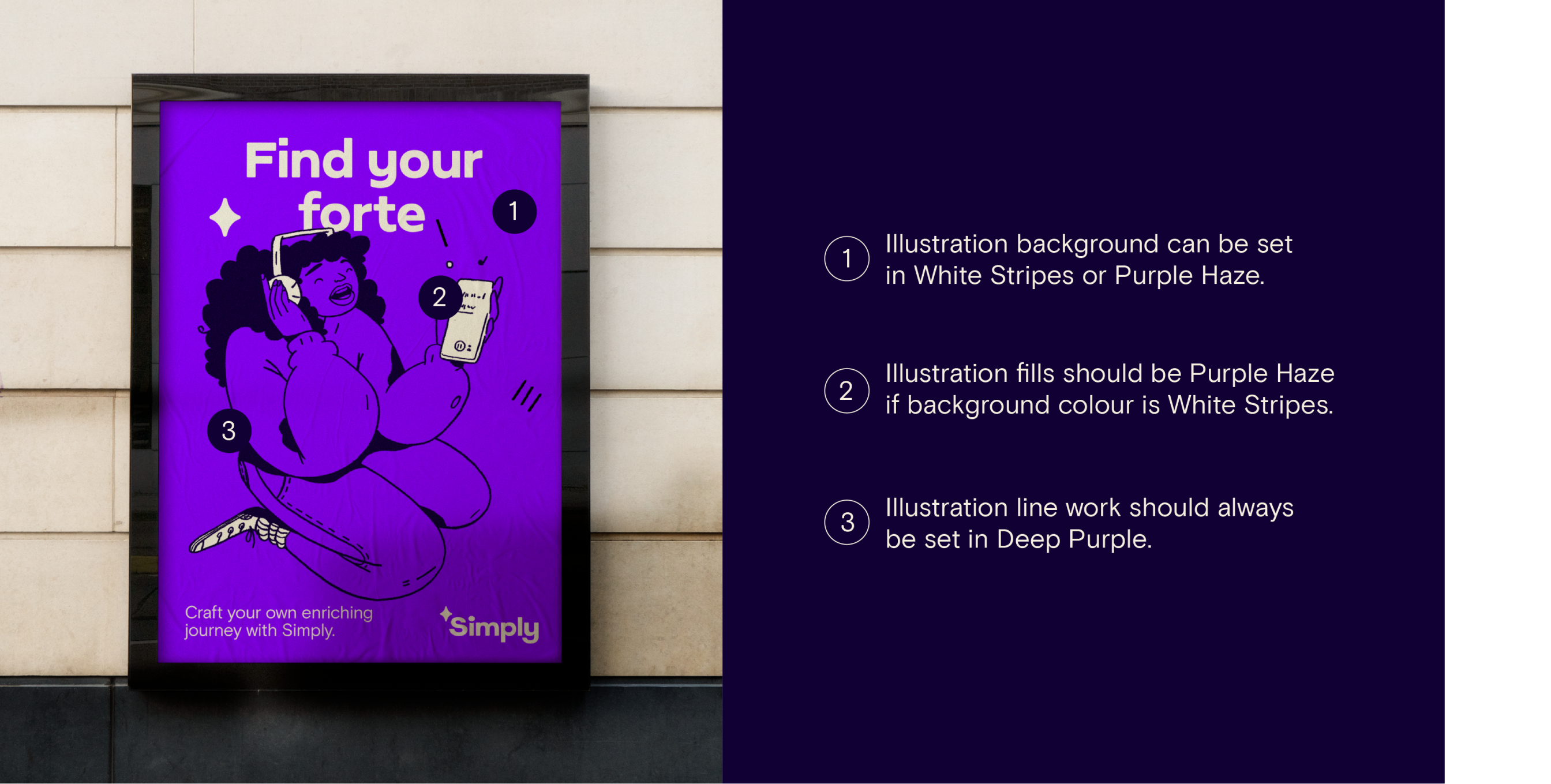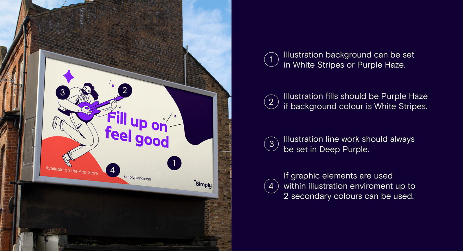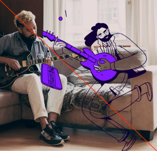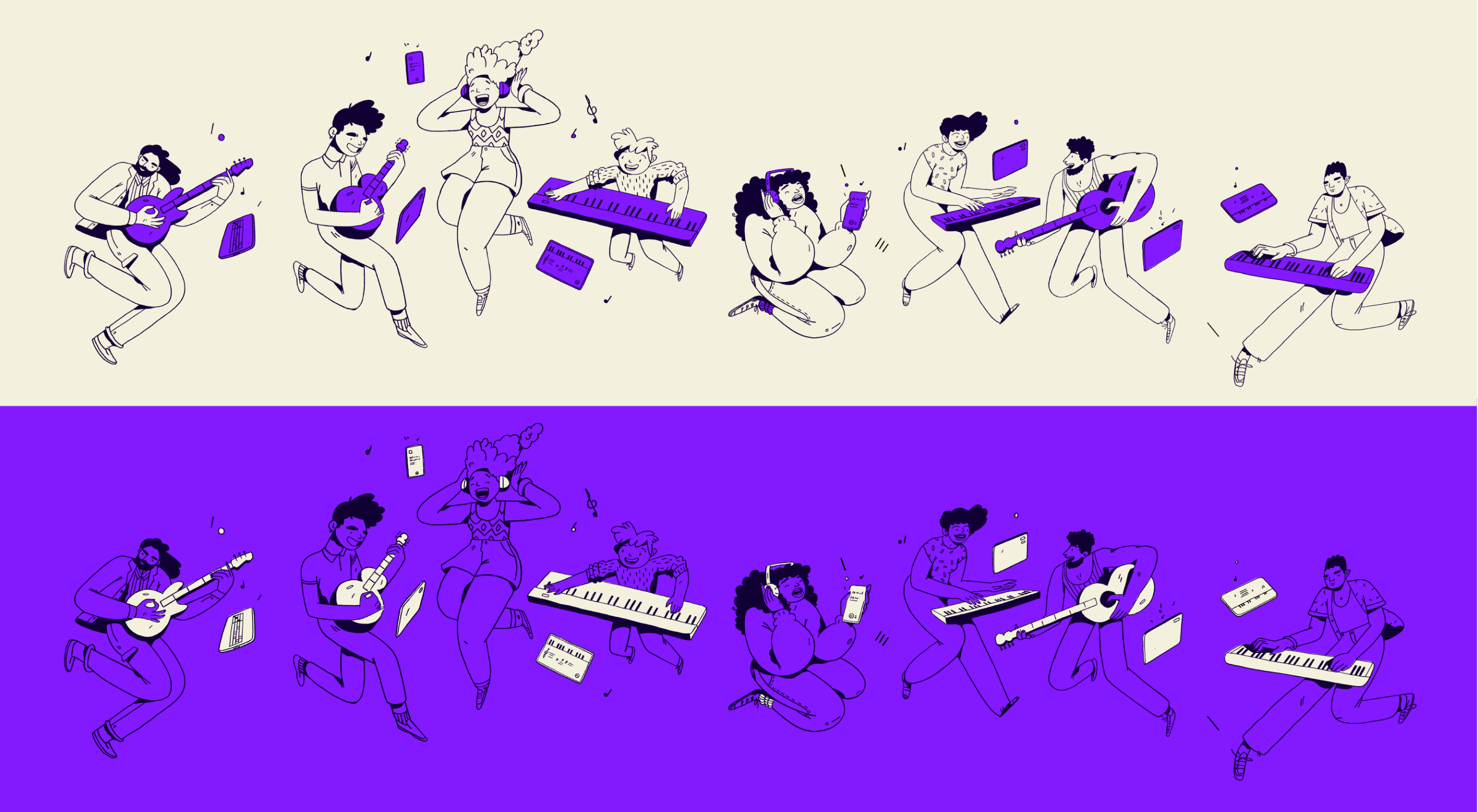 We have 4 illustration pillars that make our illustrations uniquely Simply – Authenticity, Emotion, Line art and Dynamism. These should be the starting point for creating our illustration style and ensures we avoid looking like corporate memphis. Here is an overview of our illustration style showing authentic people experiencing the joy of playing a musical instrument in their home.