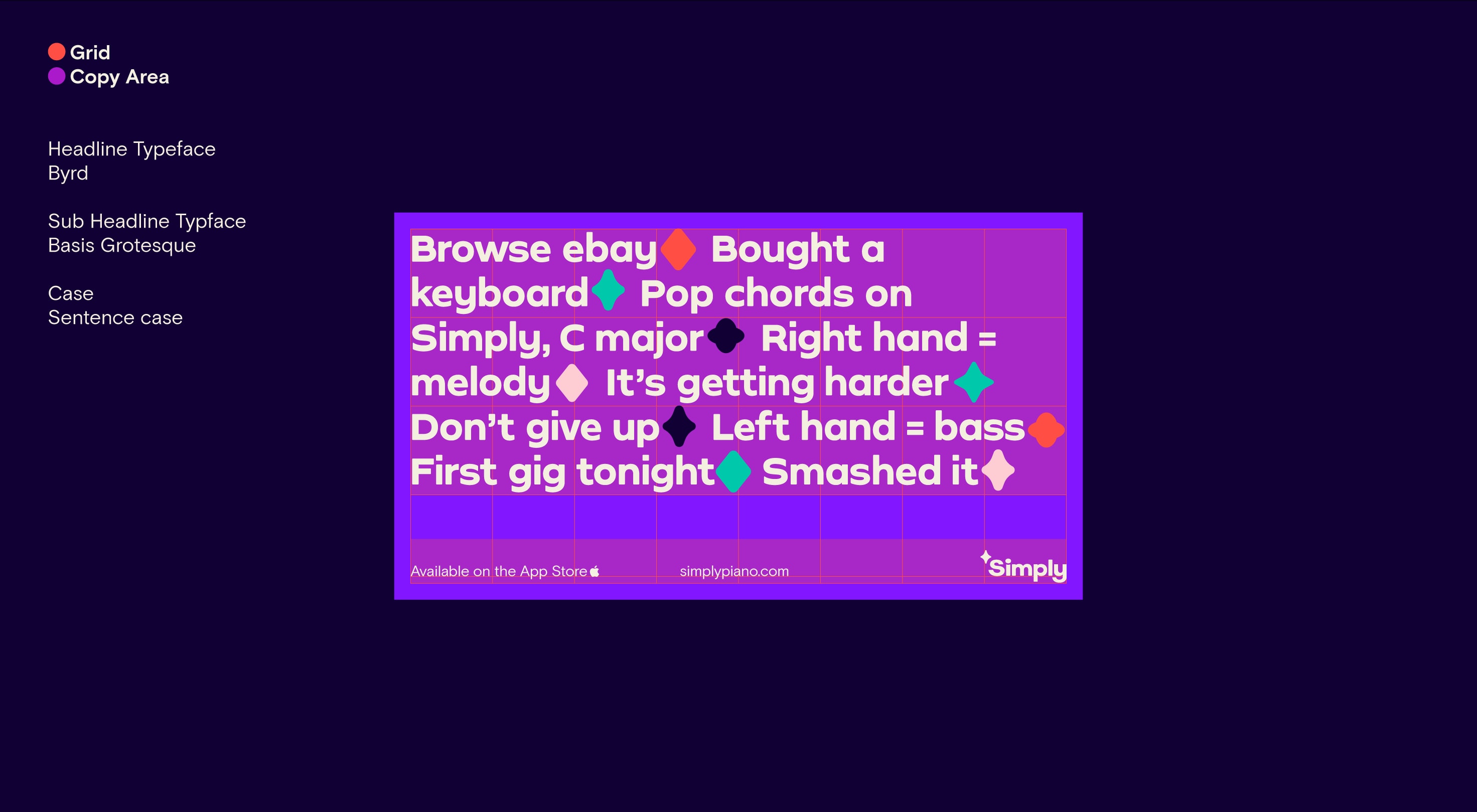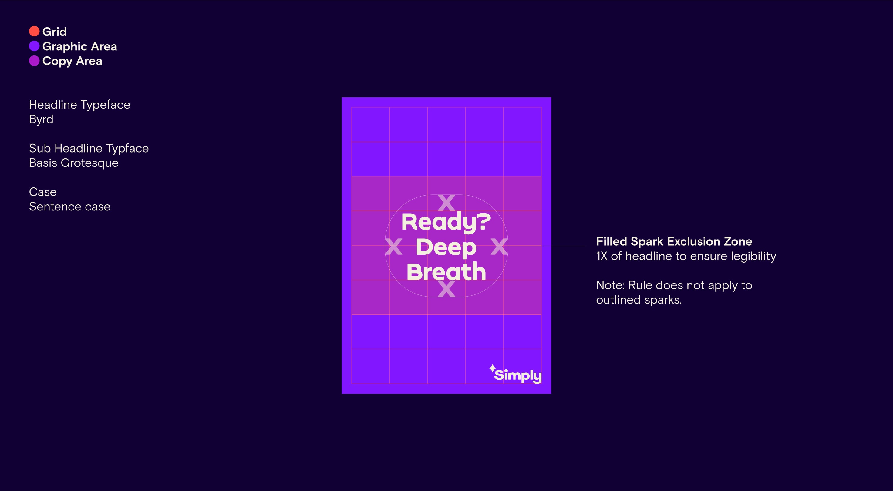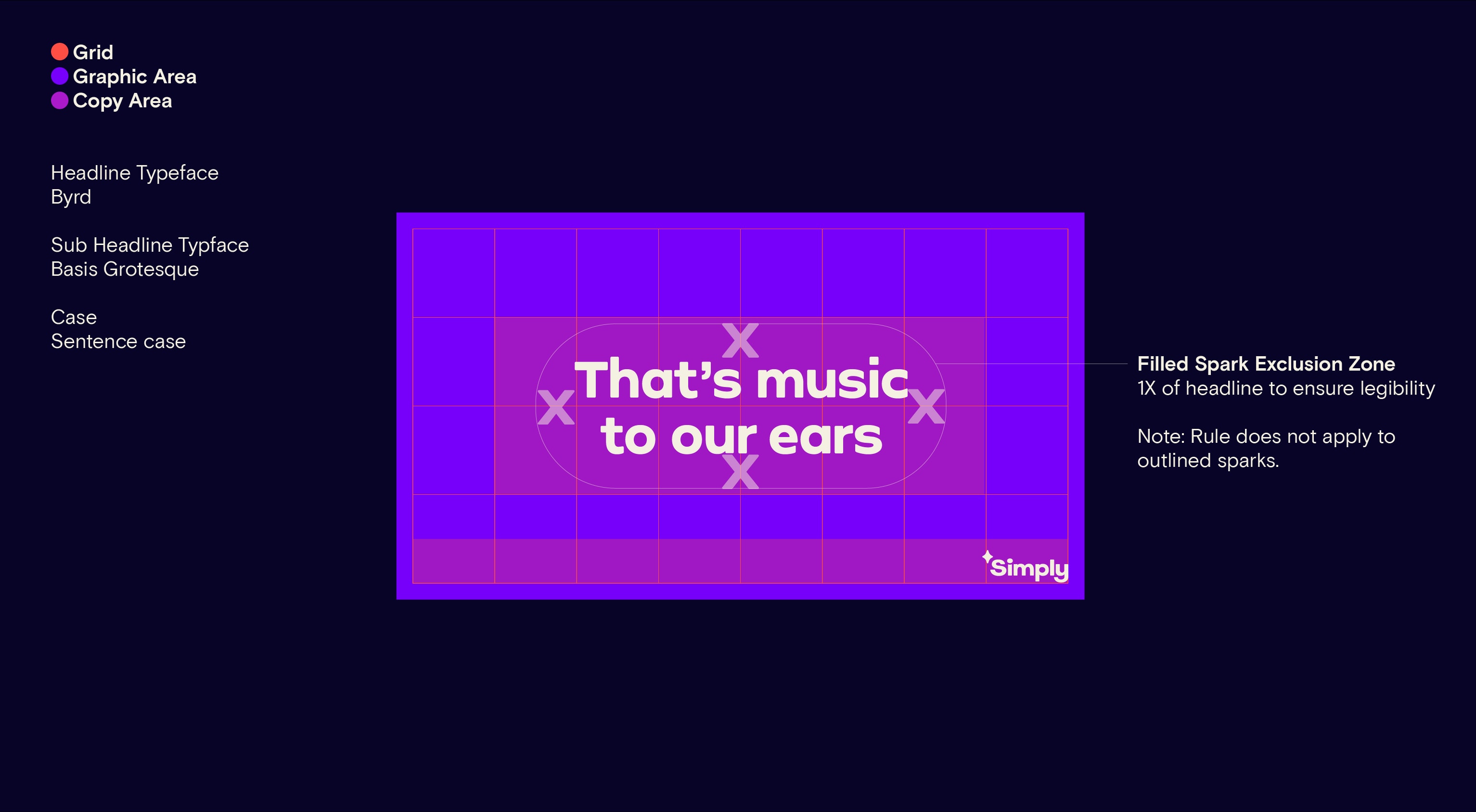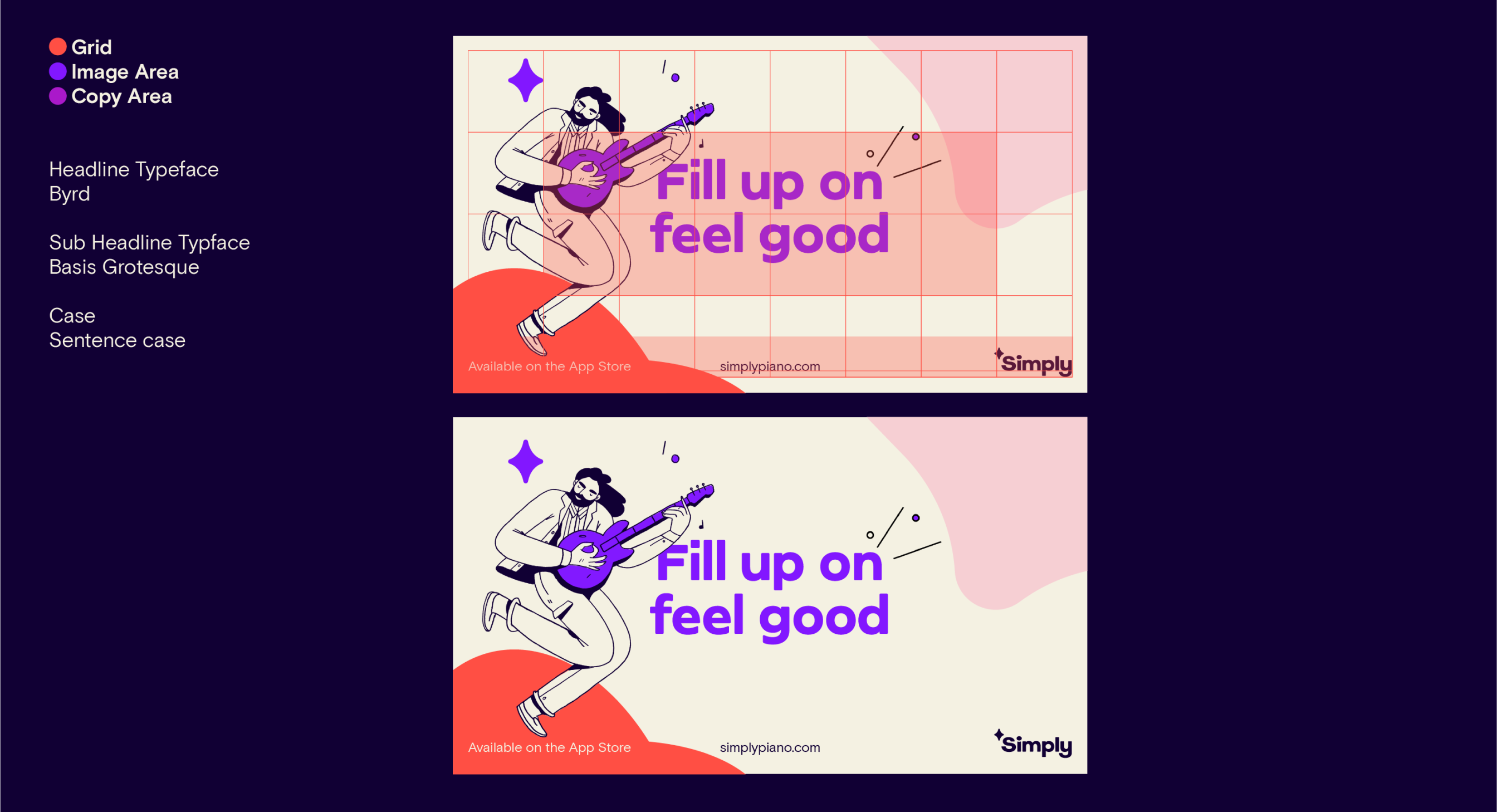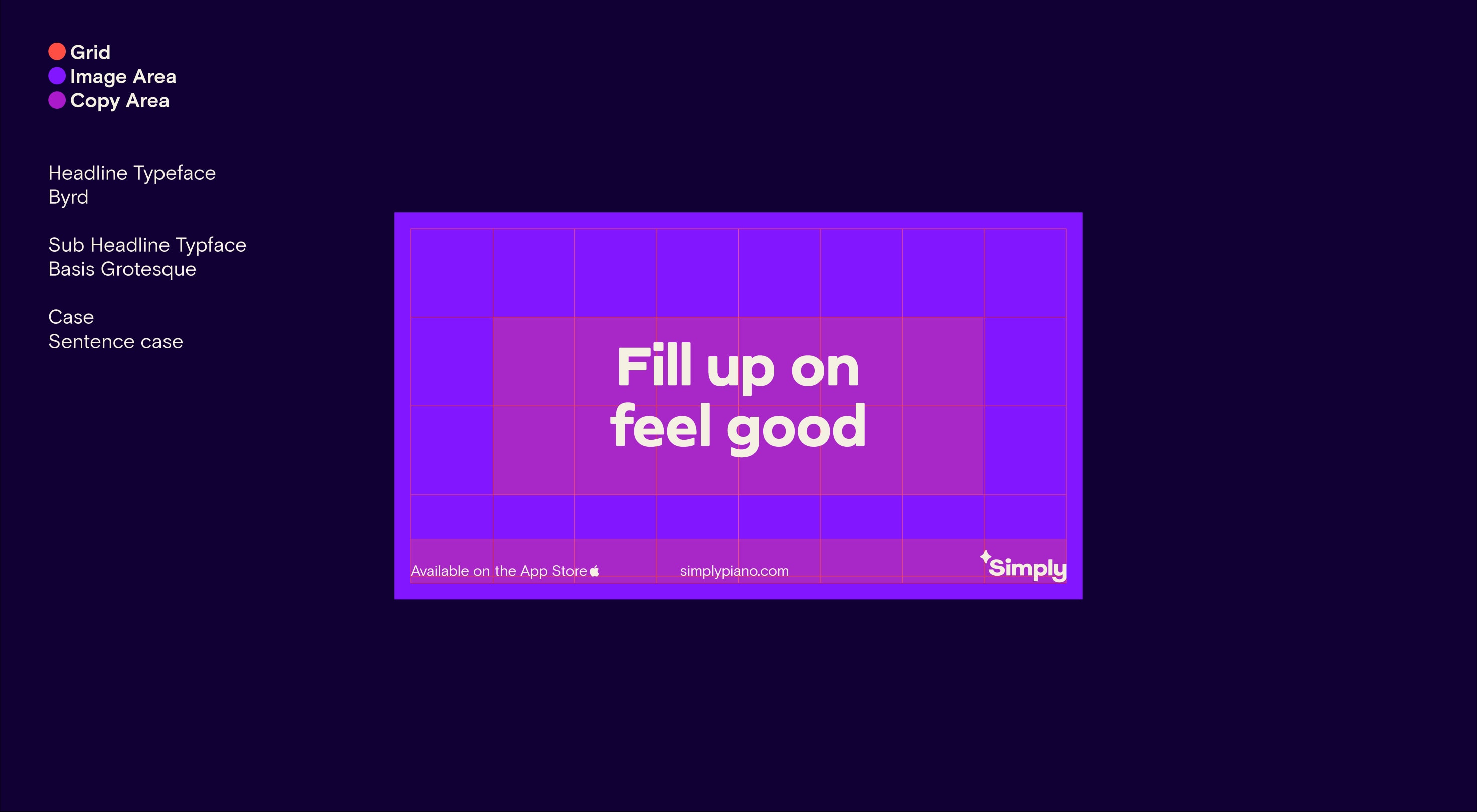 Each layout is underpinned by a margin and grid. The S of the logo size determines exactly how big our margins are. Depending on the format, the logo can appear at two different sizes to ensure it maintains a confident yet legible presence on the application.