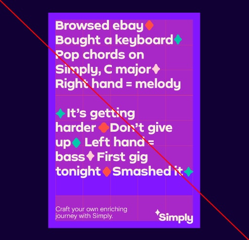 Here is an example of how an emailer can be approached. We can have any primary color way as a background as this gives us the flexibility and hierarchy we need across all our different eCRM messages. Our sparks elements help to give our visuals additional depth and show moments within our journey trail. Ensure typography is highly legible and follows typography color rules.