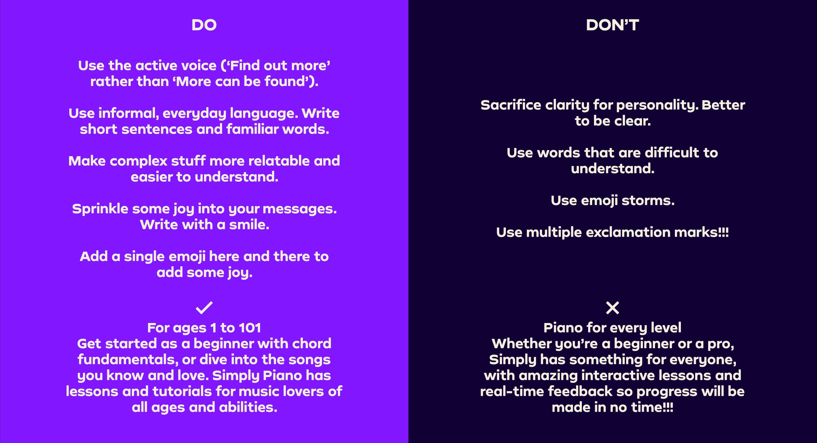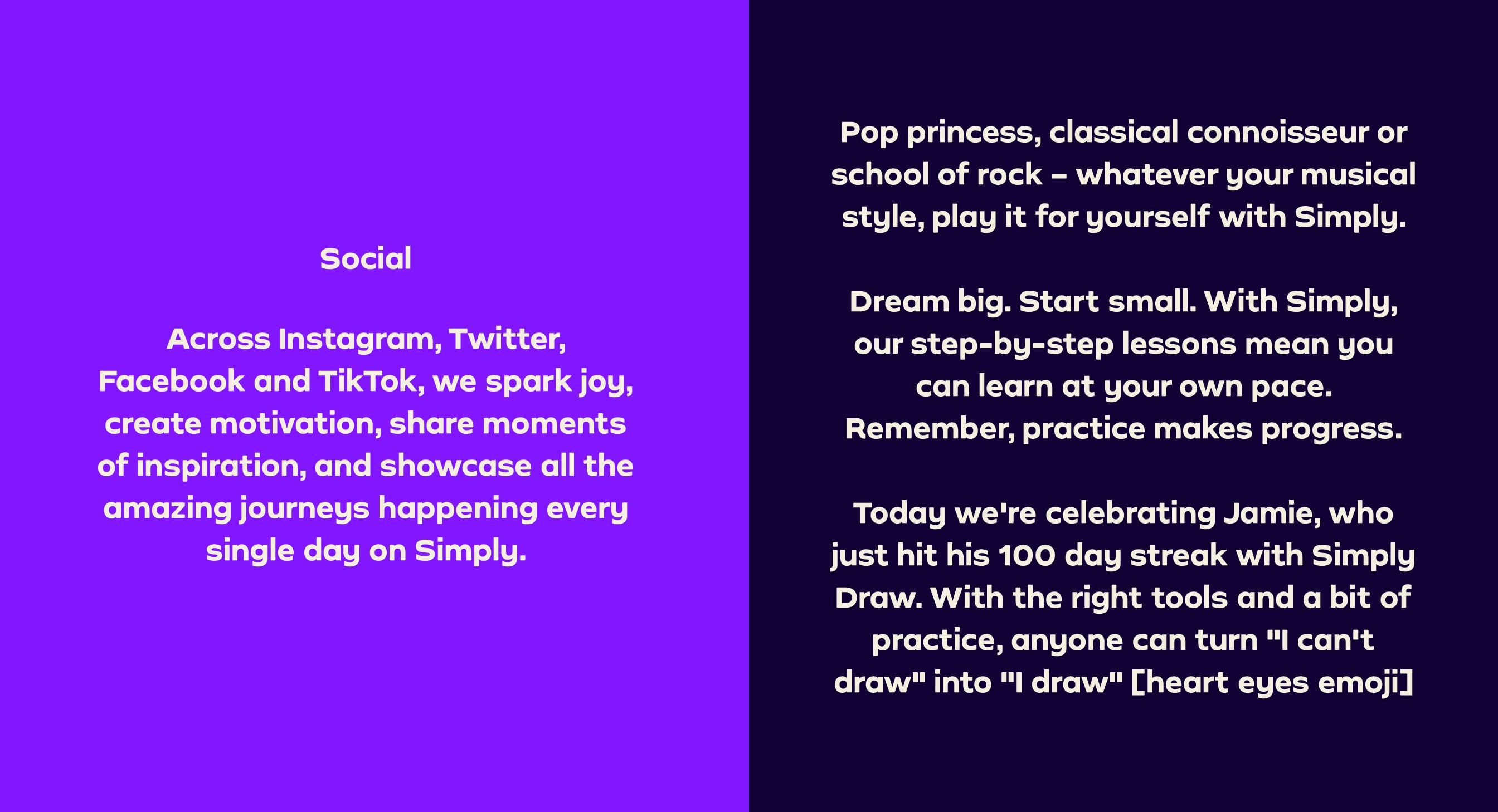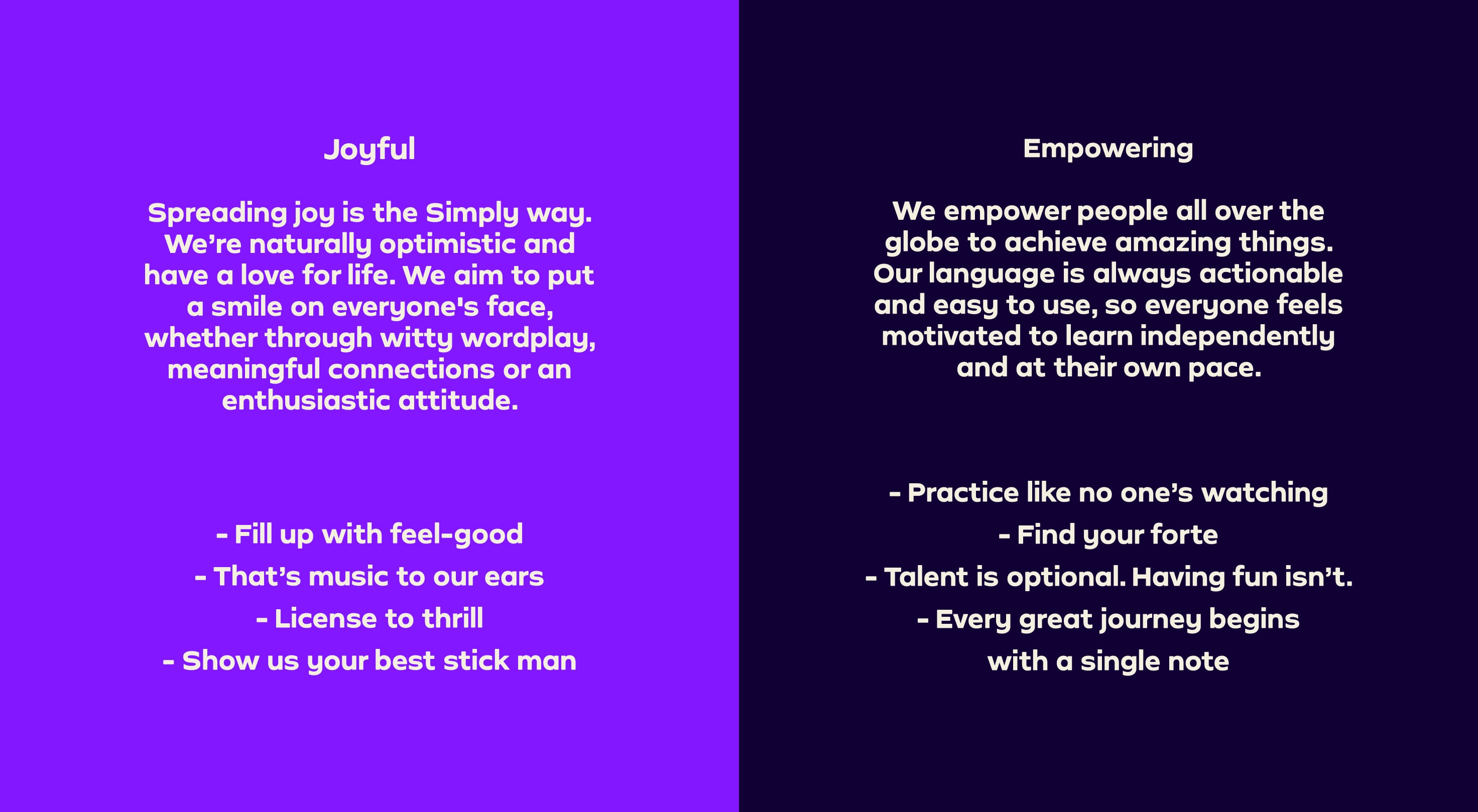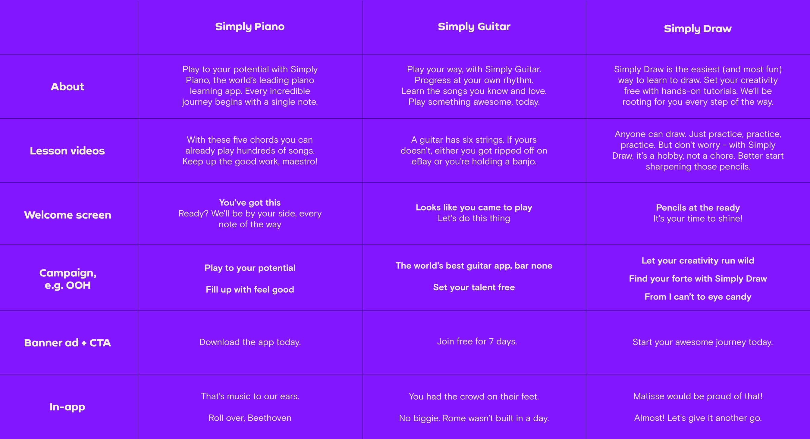 Our Tone of Voice flexes and adapts across our different brand personalities. Whether we’re writing for the family-friendly Simply Piano, the slightly irreverent Simply Guitar or the cool Simply Draw, we still make sure we sound unmistakably Simply.