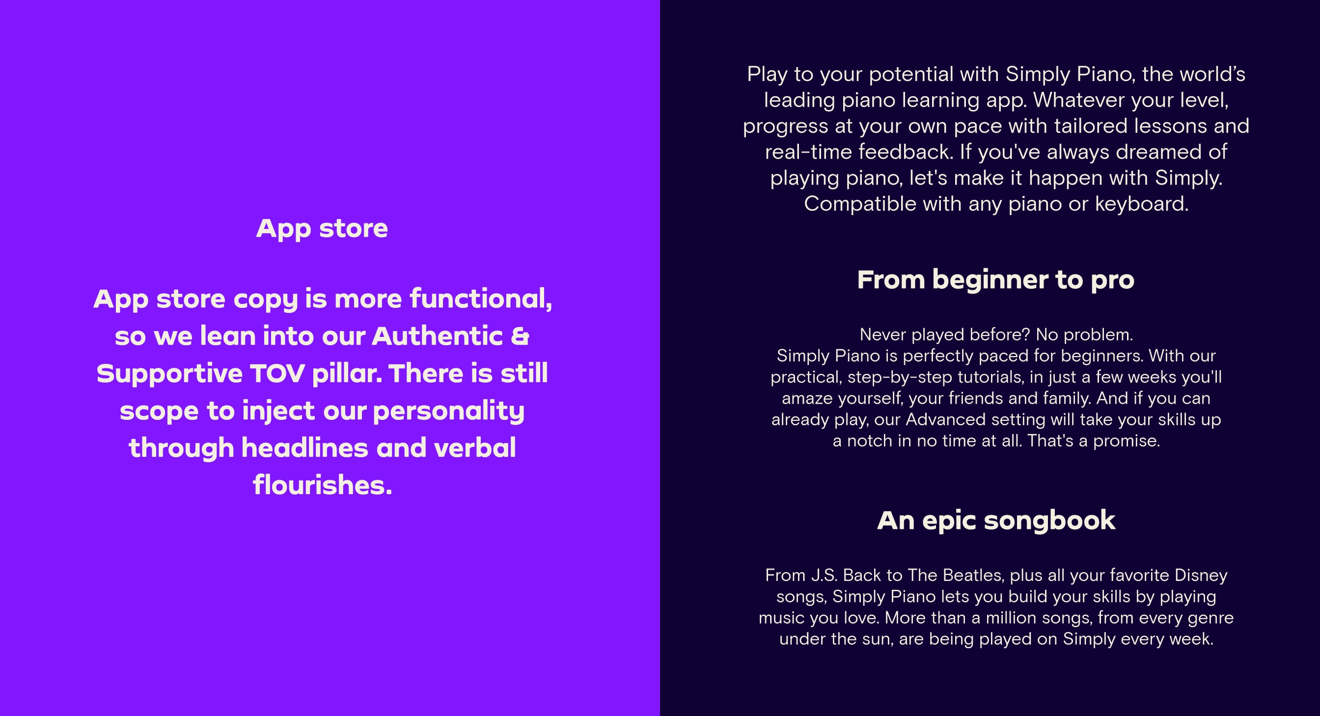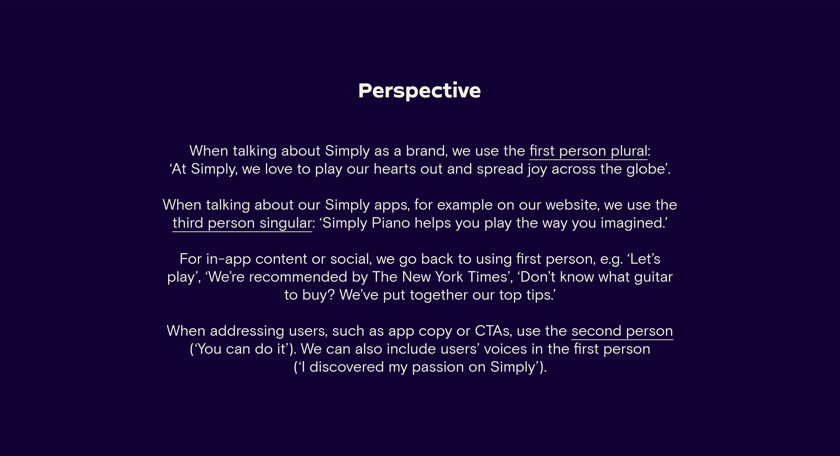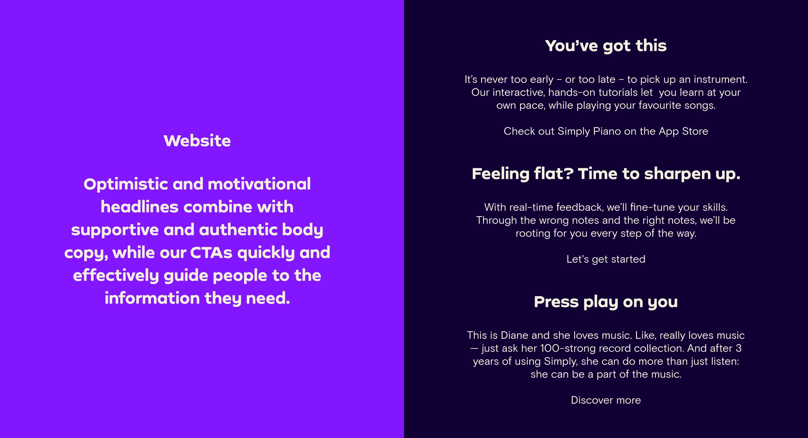 Our Tone of Voice flexes and adapts across our different brand personalities. Whether we’re writing for the family-friendly Simply Piano, the slightly irreverent Simply Guitar or the cool Simply Draw, we still make sure we sound unmistakably Simply.