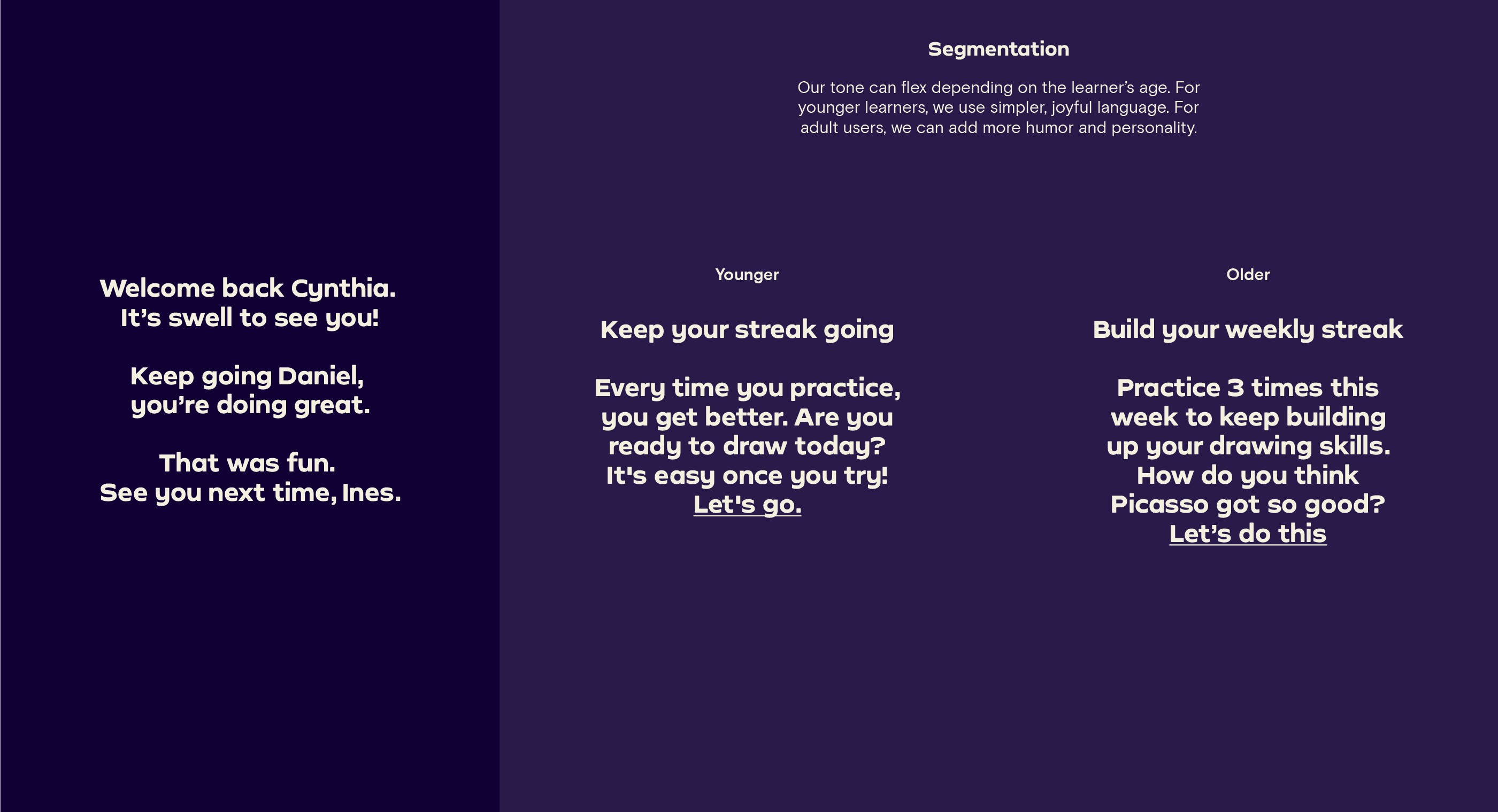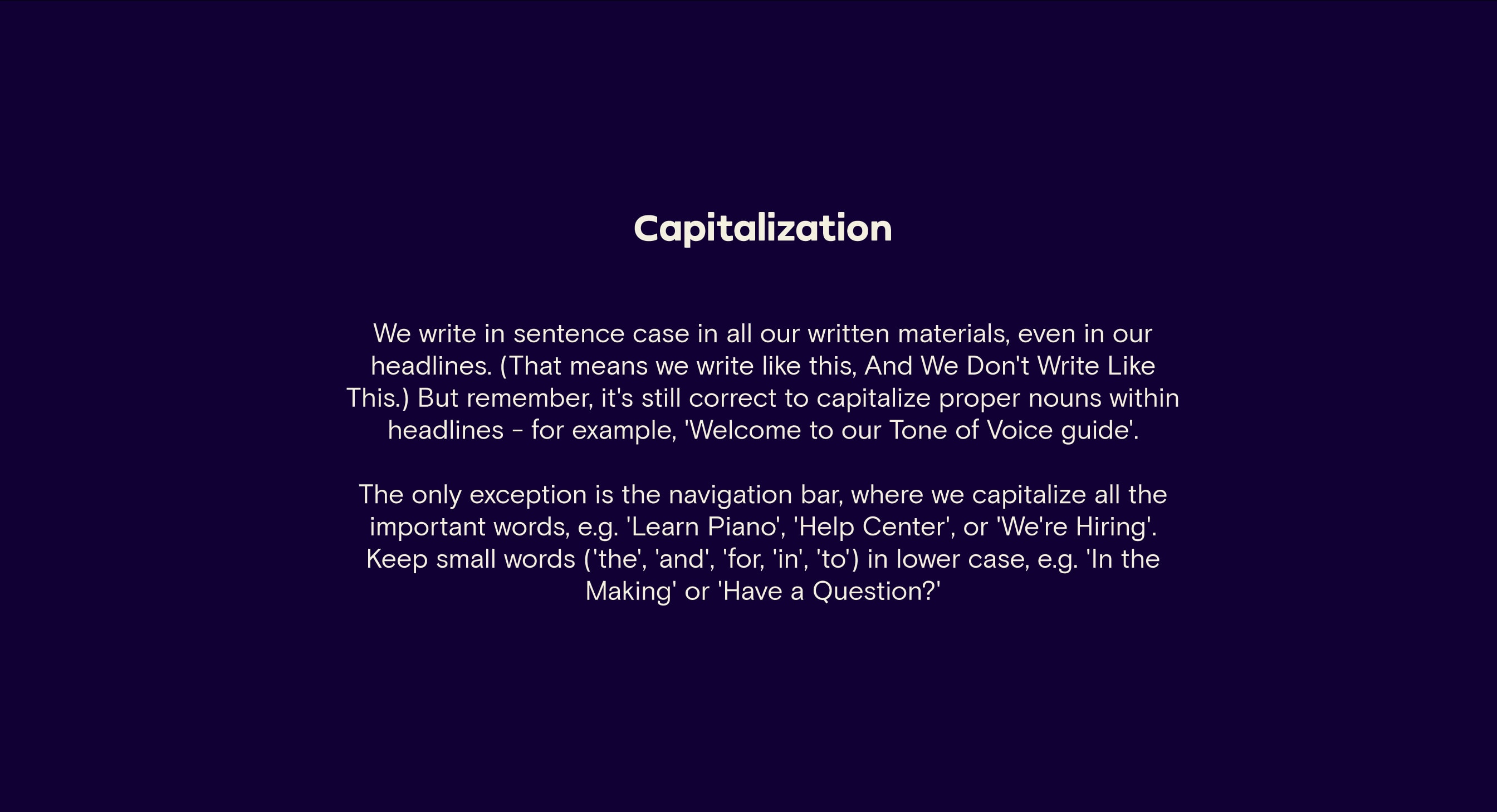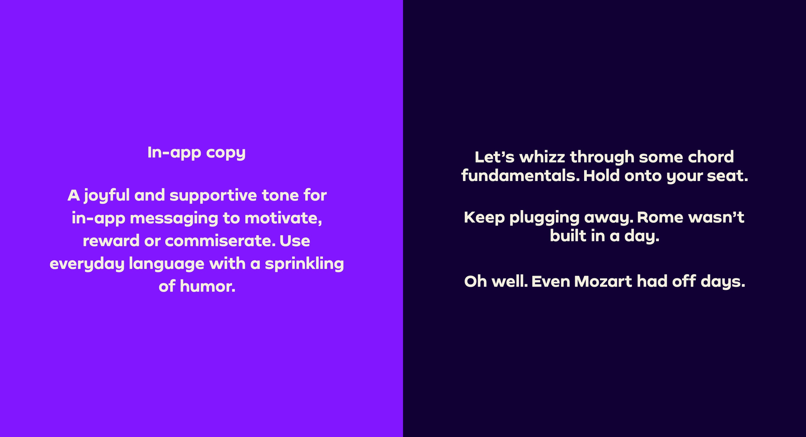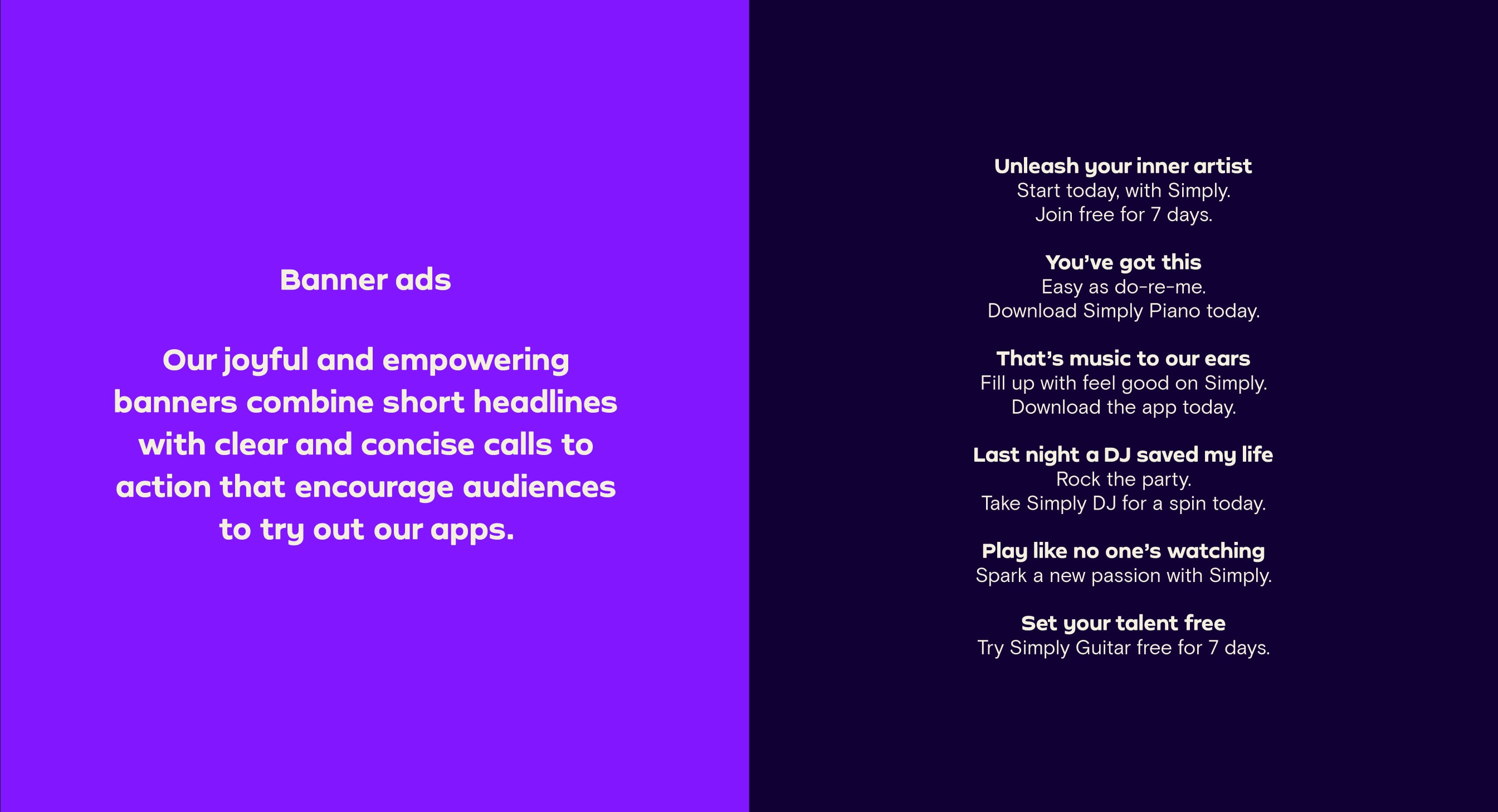 Our Tone of Voice flexes and adapts across our different brand personalities. Whether we’re writing for the family-friendly Simply Piano, the slightly irreverent Simply Guitar or the cool Simply Draw, we still make sure we sound unmistakably Simply.