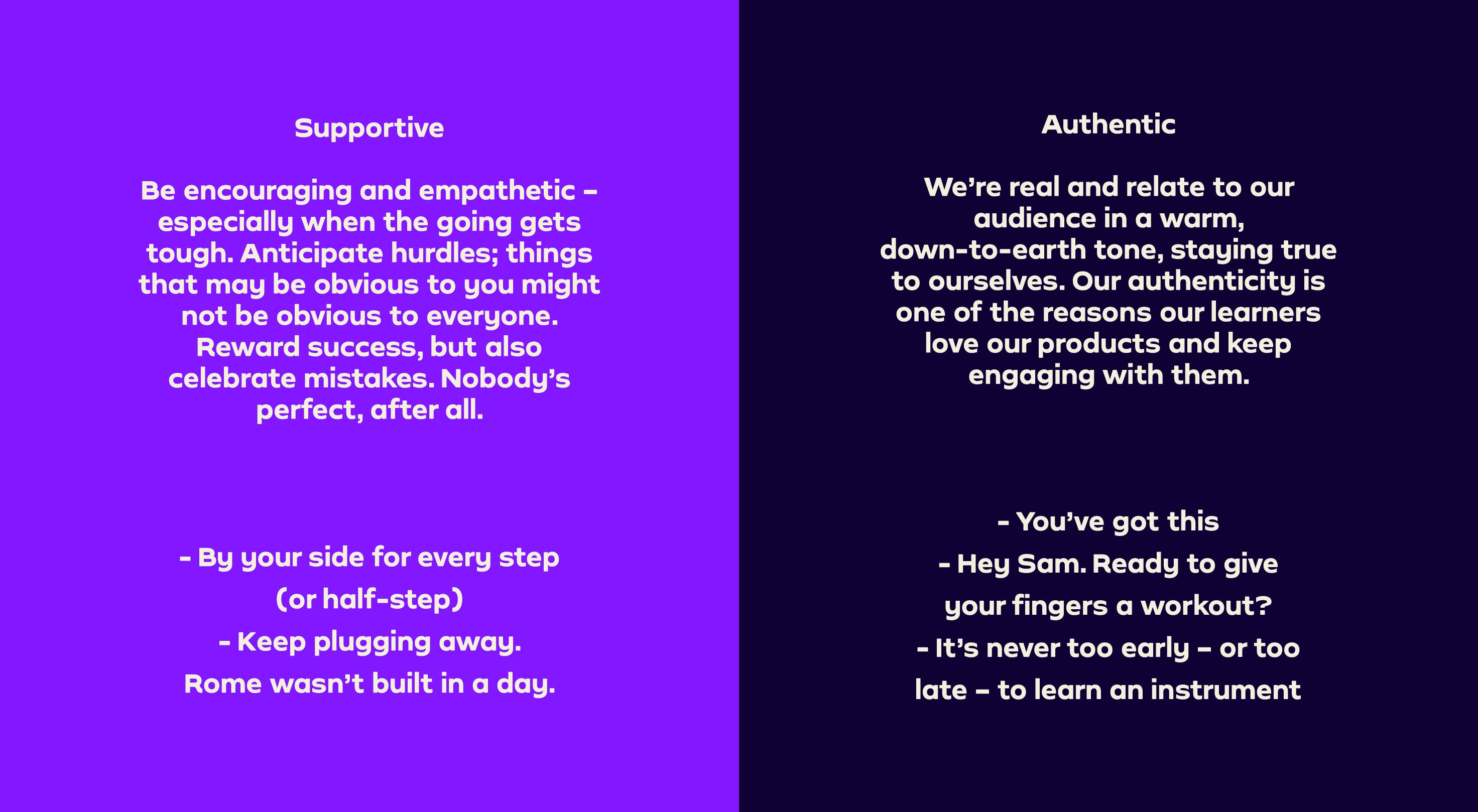 We can easily adjust how we want to sound by referring to our sliding scale. It helps us visualize how our tone changes between ‘Joyful & Empowering’ and ‘Supportive & Authentic’, and tailor our voice according to the audience or channel we’re writing for.