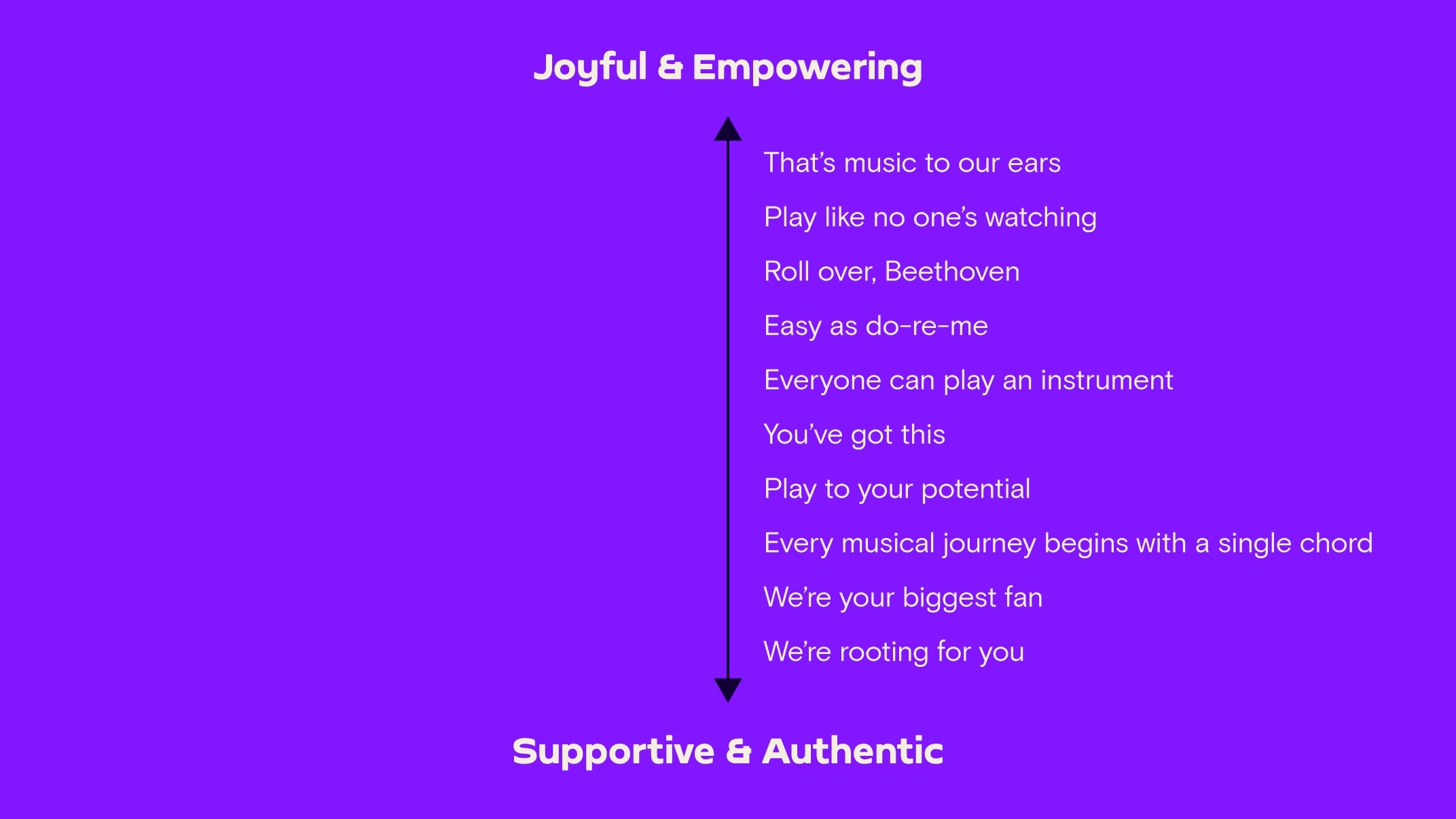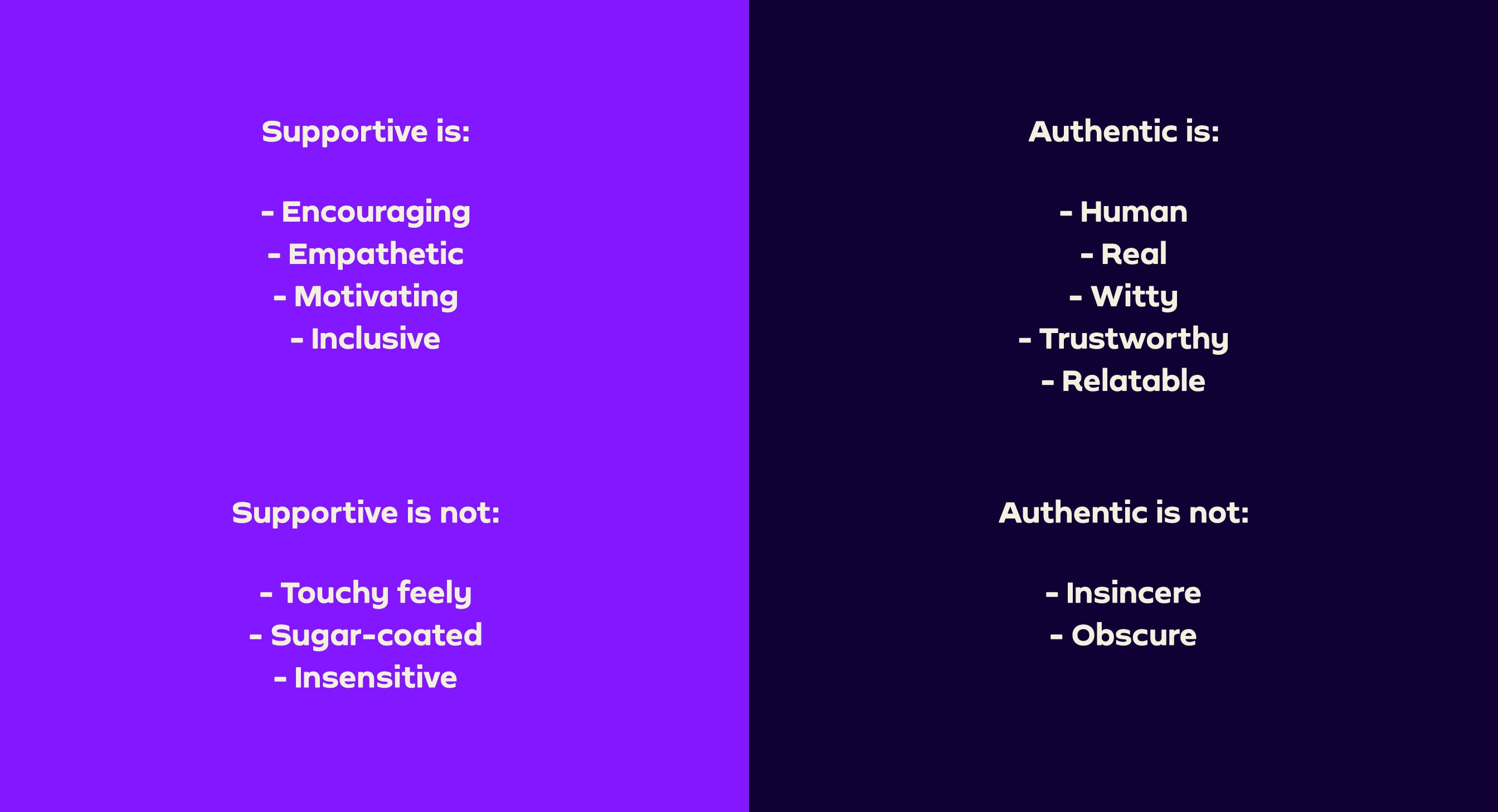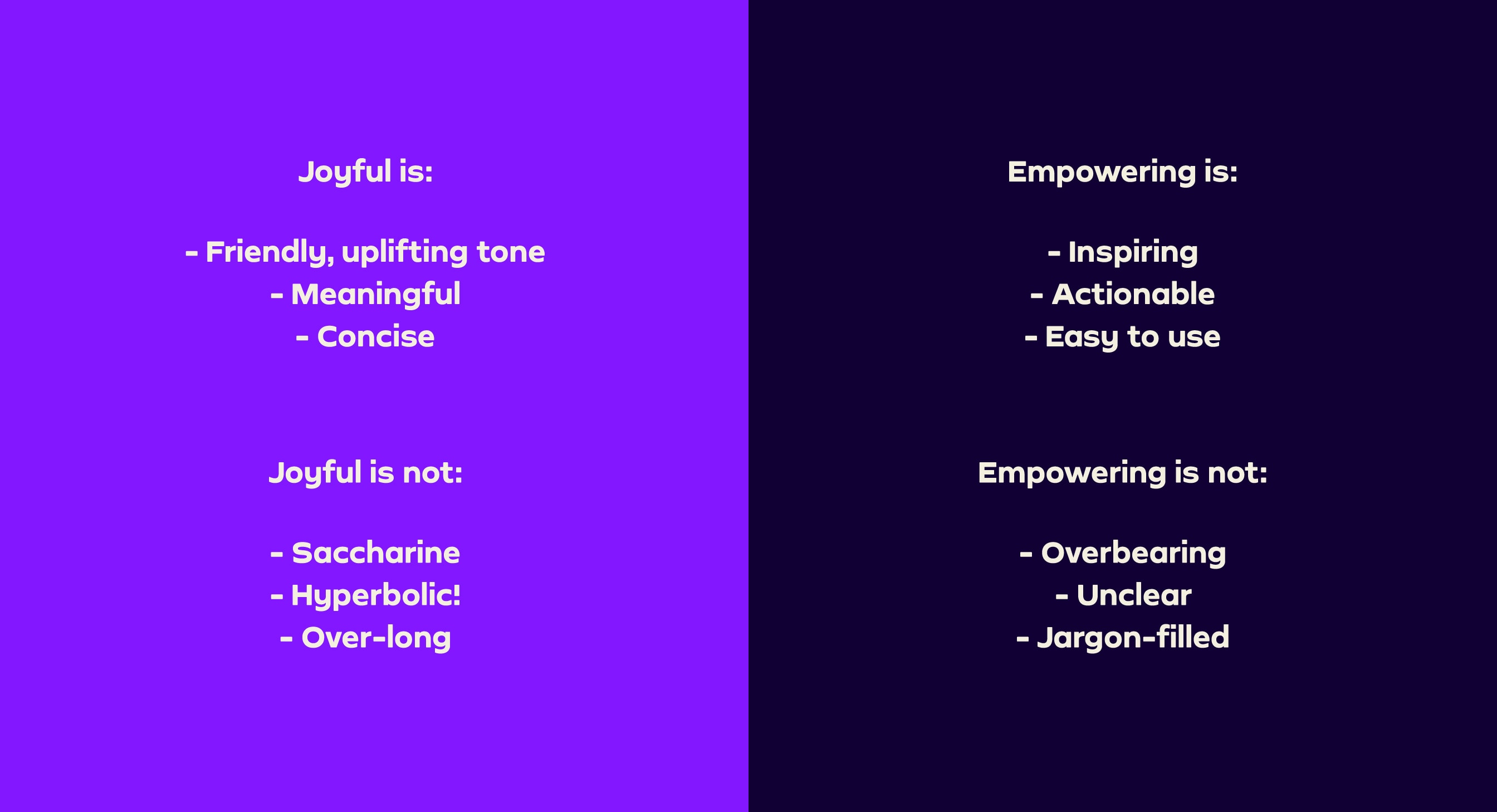 Our two pillars (Joyful & Empowering, Supportive & Authentic) are complementary and work together. For our high points, we can dial up our Joyful & Empowering tone. For lows, we can be more Supportive and Authentic.
