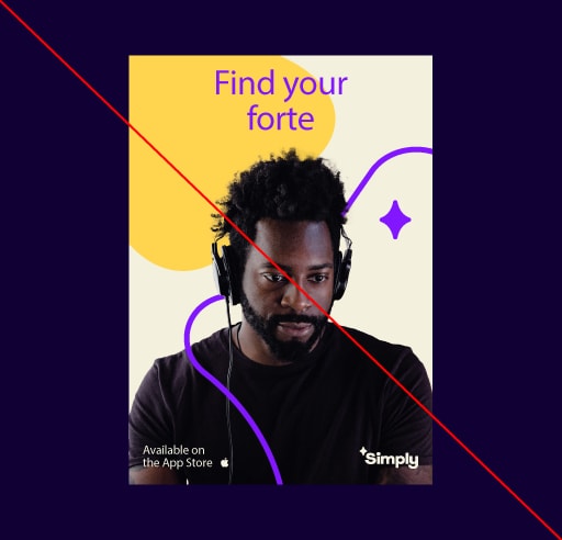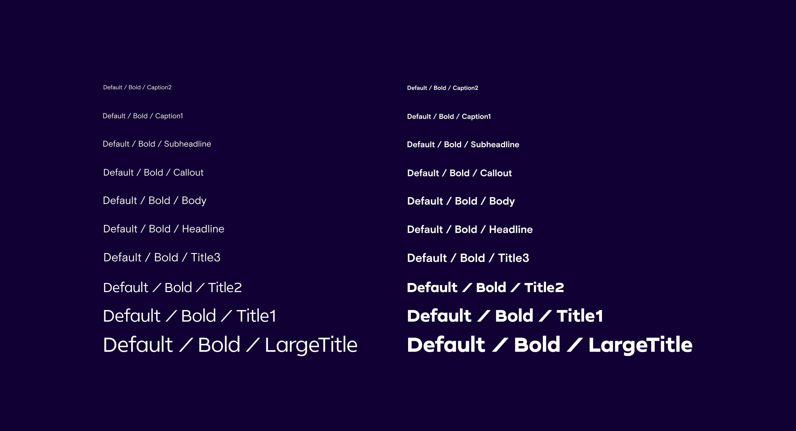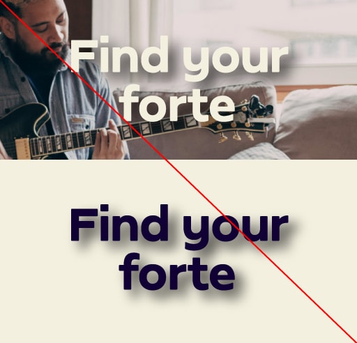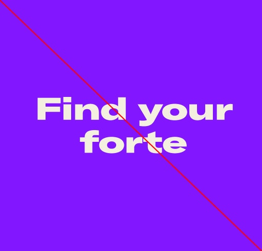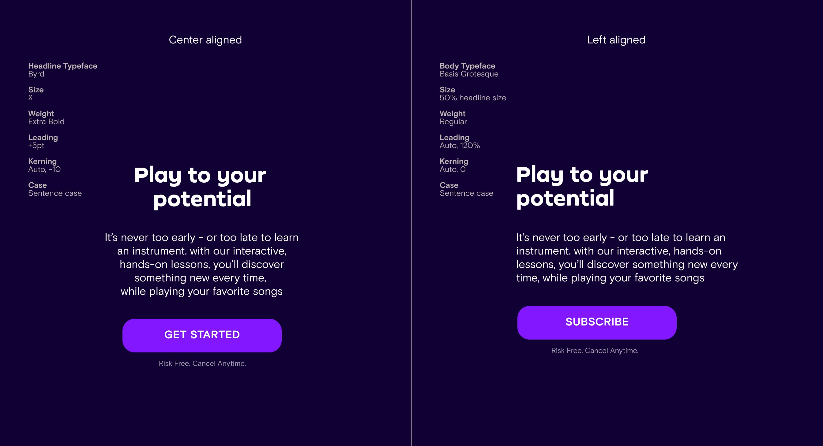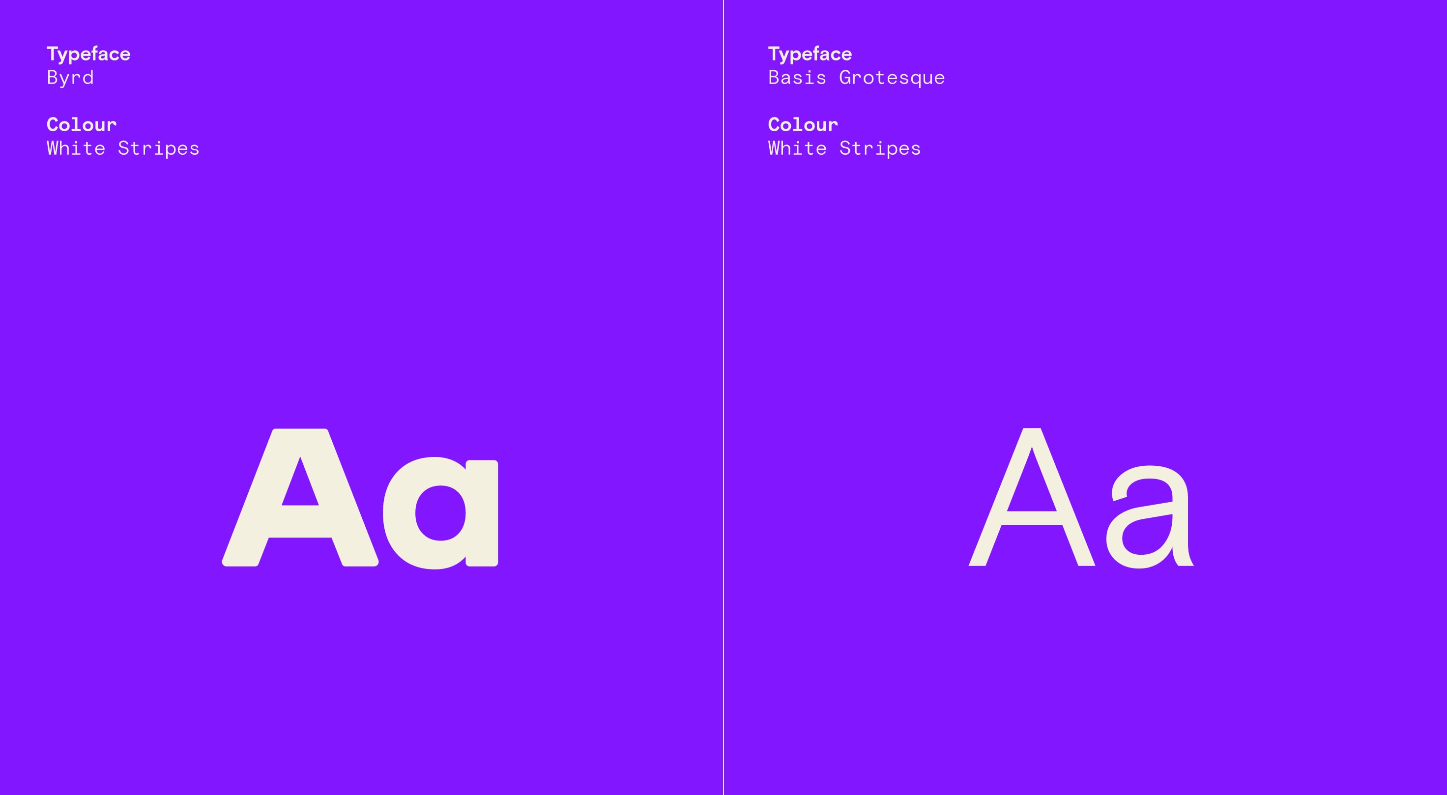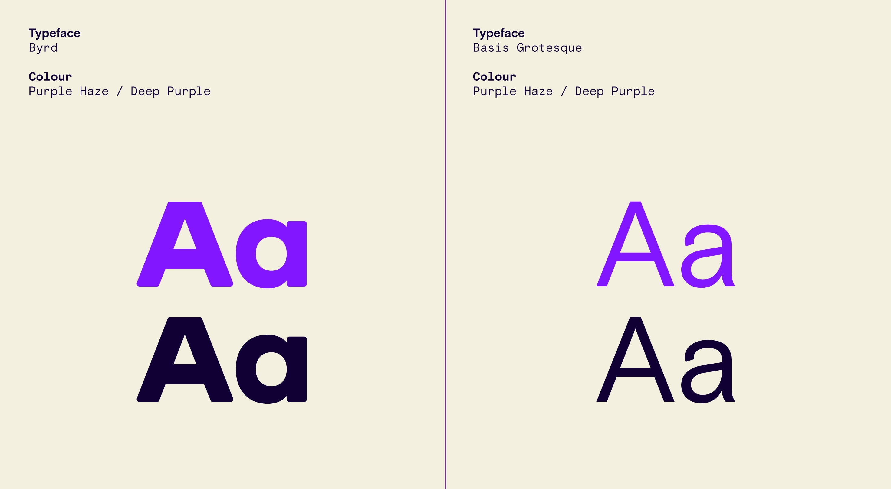Our typography can sit over the top of 3 background colors (Purple Haze, Deep Purple and White Stripes). Each background color has a preferred typecolour combination to ensure we retain maximum legibility.